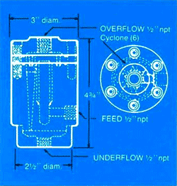 Six 10mm cyclones manifolded in a patented common pressurized housing. Clog-proof design, adjustable capacity and self contained strainer. Available in 316 SS, maximum working pressure 2000 psi up to a maximum operating temperature of 400°F. |