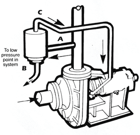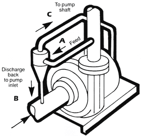 This is an example of a typical Doxie cyclone installation on a centrifugal pump to provide clean, abrasive-free injection flow for flushing the surfaces of a mechanical shaft seal. A is the feed inlet to the cyclone, B is particle-bearing underflow return, and C is clean overflow routed to the seal.