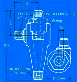 Cleaned liquid spins into the center of the cyclone and is forced upward and out the overflow discharge. This clean stream is then routed through tubing to the place of usage-the mating surfaces of the shaft seal or to the bearings.