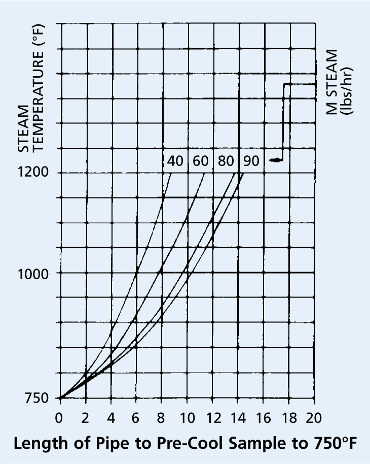 Precooling can be accomplished by installing a pipe between the main steam header and the sample cooler to radiate excess heat. The length of the pipe is determined from the chart at left.