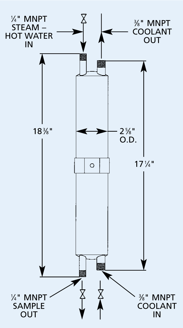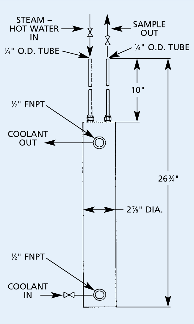 Proper installation requires valves on sample inlet and cooling water inlet for hot water service. An additional valve must be installed on the sample outlet for all vapor or steam services to obtain required operating pressures in the coil.